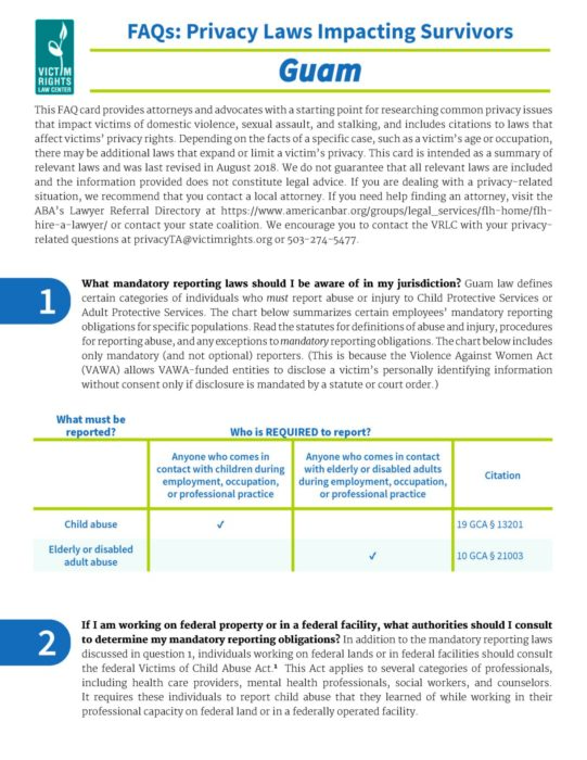 This FAQ provides attorneys and advocates with a starting point for researching common privacy issues that impact victims of domestic violence, sexual assault, and stalking, and includes citations to laws that affect victims’ privacy rights.