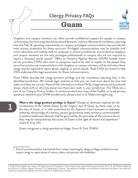 These FAQs describe the clergy-penitent privilege and the mandatory reporting laws in the identified jurisdiction. We include legal citations so that you can read more about the laws and make sure they are current.