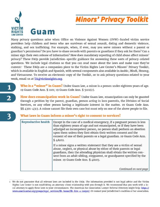 These FAQs provide guidance for answering the many privacy questions that arise when victim service providers help children and teens who are survivors of sexual assault, dating and domestic violence, stalking, and sex trafficking.