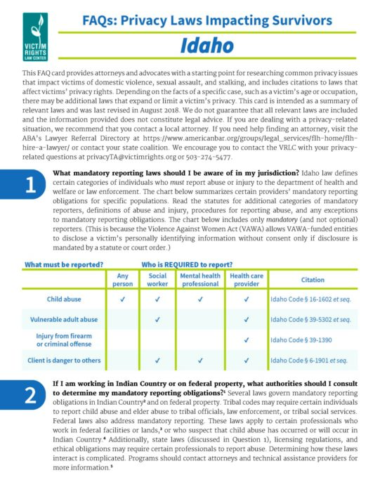 This FAQ provides attorneys and advocates with a starting point for researching common privacy issues that impact victims of domestic violence, sexual assault, and stalking, and includes citations to laws that affect victims’ privacy rights.
