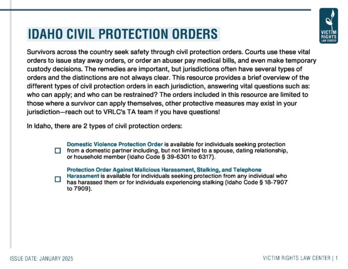 This resource provides a brief overview of the different types of civil protection orders that may be available to survivors, answering vital questions such as who can apply, who can be restrained, and how to apply.