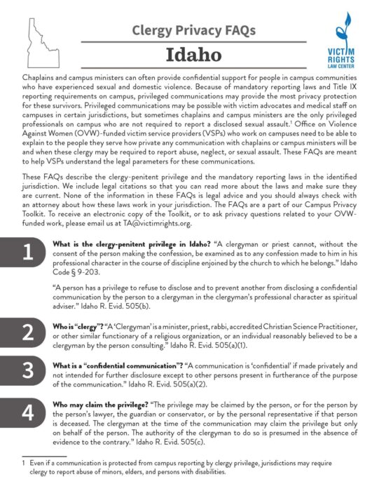 These FAQs describe the clergy-penitent privilege and the mandatory reporting laws in the identified jurisdiction. We include legal citations so that you can read more about the laws and make sure they are current.