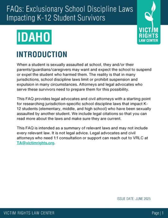 These FAQs provide legal advocates and civil attorneys with a starting point for researching jurisdiction-specific school discipline laws that impact K-12 students who have been sexually assaulted by another student.
