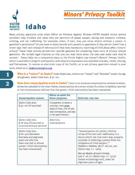 These FAQs provide guidance for answering the many privacy questions that arise when victim service providers help children and teens who are survivors of sexual assault, dating and domestic violence, stalking, and sex trafficking.