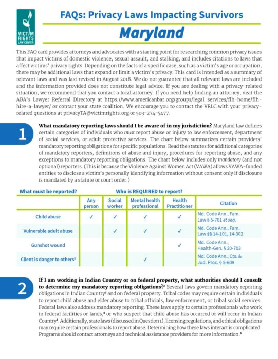 This FAQ provides attorneys and advocates with a starting point for researching common privacy issues that impact victims of domestic violence, sexual assault, and stalking, and includes citations to laws that affect victims’ privacy rights.