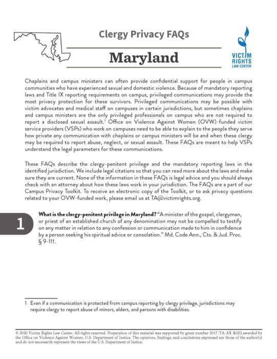 These FAQs describe the clergy-penitent privilege and the mandatory reporting laws in the identified jurisdiction. We include legal citations so that you can read more about the laws and make sure they are current.