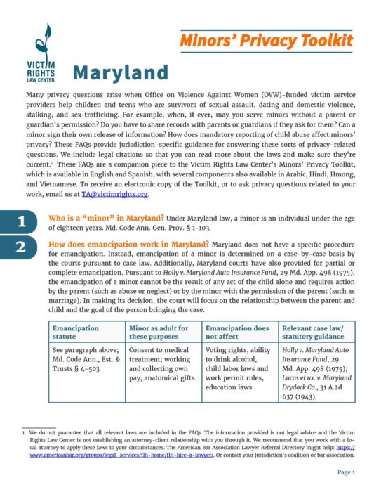 These FAQs provide guidance for answering the many privacy questions that arise when victim service providers help children and teens who are survivors of sexual assault, dating and domestic violence, stalking, and sex trafficking.
