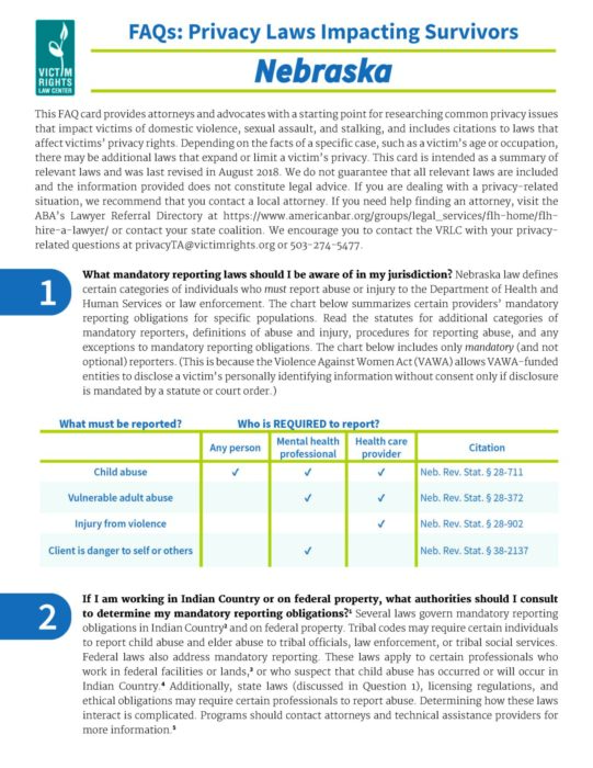 This FAQ provides attorneys and advocates with a starting point for researching common privacy issues that impact victims of domestic violence, sexual assault, and stalking, and includes citations to laws that affect victims’ privacy rights.