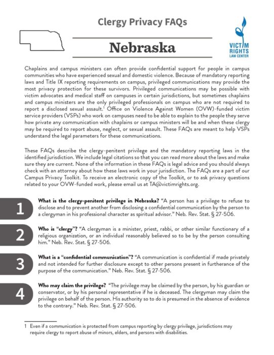 These FAQs describe the clergy-penitent privilege and the mandatory reporting laws in the identified jurisdiction. We include legal citations so that you can read more about the laws and make sure they are current.