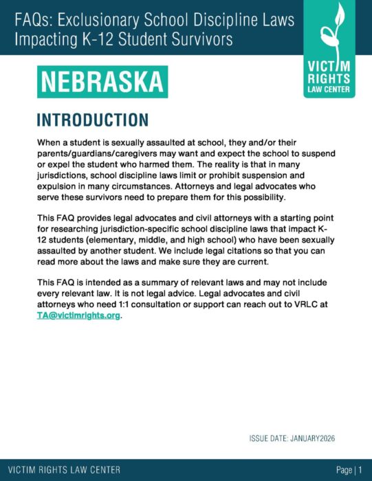 These FAQs provide legal advocates and civil attorneys with a starting point for researching jurisdiction-specific school discipline laws that impact K-12 students who have been sexually assaulted by another student.