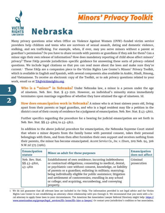 These FAQs provide guidance for answering the many privacy questions that arise when victim service providers help children and teens who are survivors of sexual assault, dating and domestic violence, stalking, and sex trafficking.
