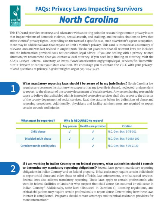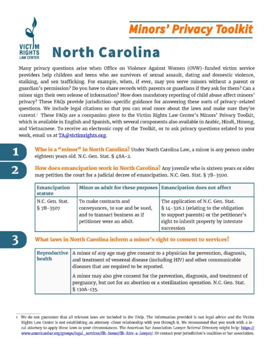 This FAQs provides guidance for answering the many privacy questions that arise when victim service providers help children and teens who are survivors of sexual assault, dating and domestic violence, stalking, and sex trafficking.