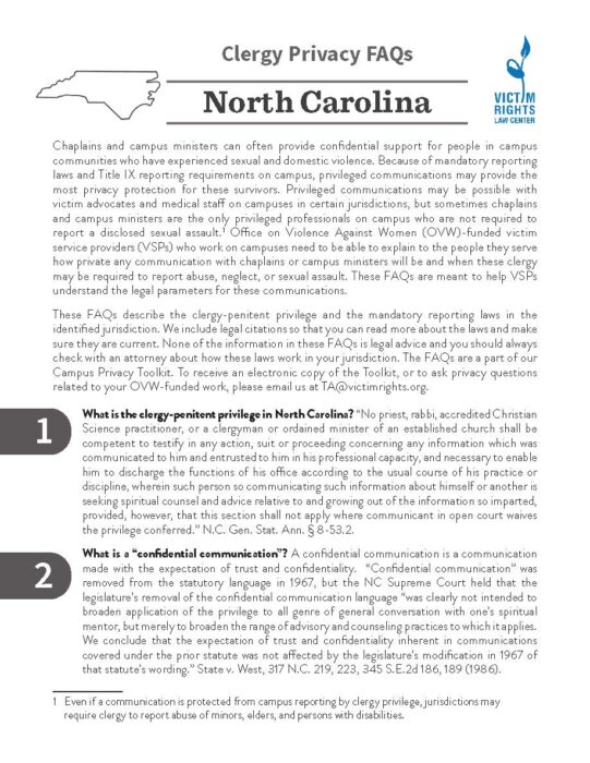 These FAQs describe the clergy-penitent privilege and the mandatory reporting laws in the identified jurisdiction. We include legal citations so that you can read more about the laws and make sure they are current.