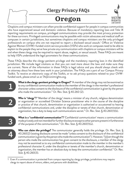 These FAQs describe the clergy-penitent privilege and the mandatory reporting laws in the identified jurisdiction. We include legal citations so that you can read more about the laws and make sure they are current.