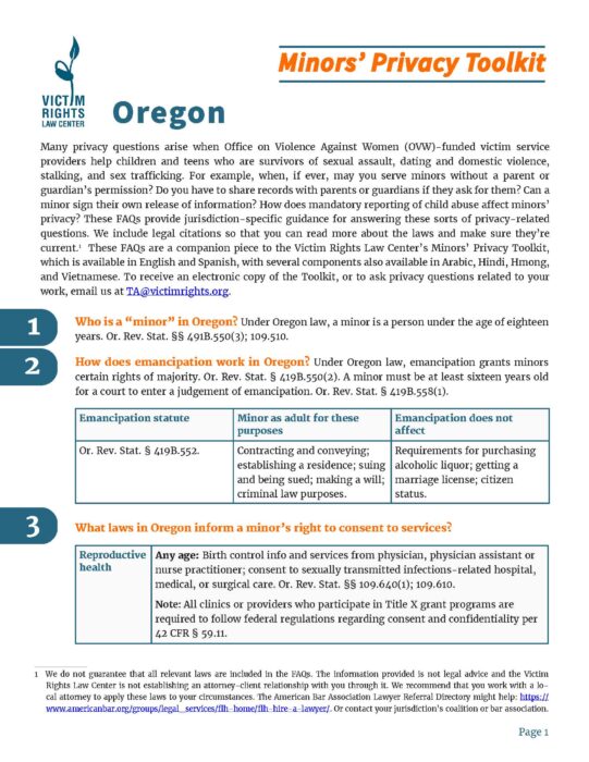 These FAQs provide guidance for answering the many privacy questions that arise when victim service providers help children and teens who are survivors of sexual assault, dating and domestic violence, stalking, and sex trafficking.