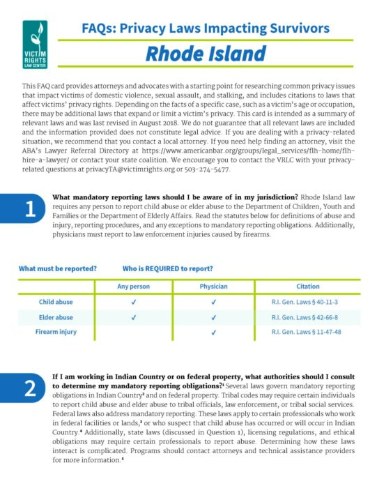 This FAQ provides attorneys and advocates with a starting point for researching common privacy issues that impact victims of domestic violence, sexual assault, and stalking, and includes citations to laws that affect victims’ privacy rights.