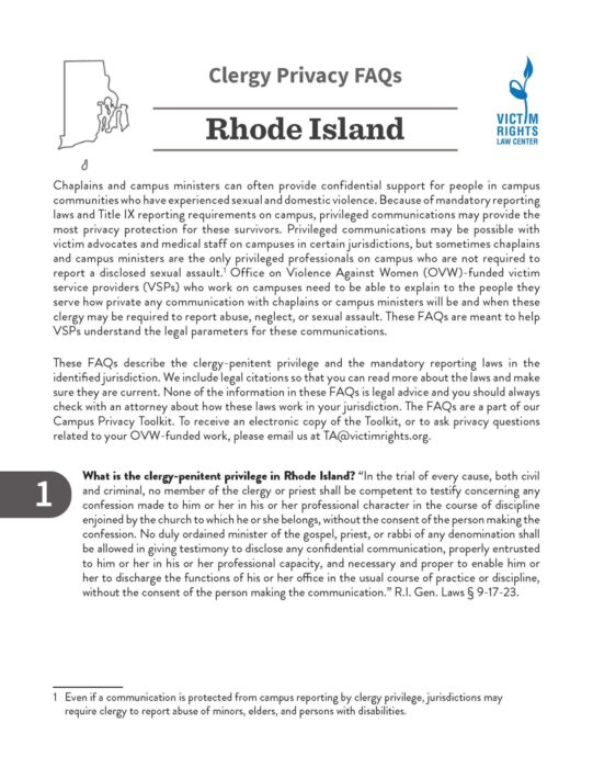 These FAQs describe the clergy-penitent privilege and the mandatory reporting laws in the identified jurisdiction. We include legal citations so that you can read more about the laws and make sure they are current.