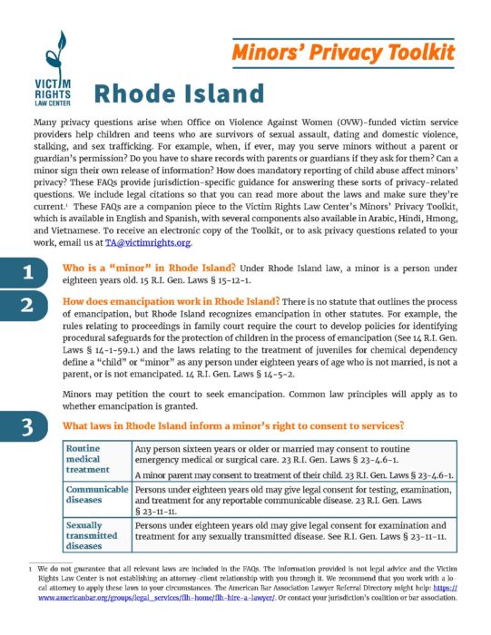 These FAQs provide guidance for answering the many privacy questions that arise when victim service providers help children and teens who are survivors of sexual assault, dating and domestic violence, stalking, and sex trafficking.