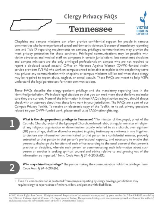 These FAQs describe the clergy-penitent privilege and the mandatory reporting laws in the identified jurisdiction. We include legal citations so that you can read more about the laws and make sure they are current.