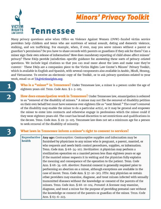 This FAQs provides guidance for answering the many privacy questions that arise when victim service providers help children and teens who are survivors of sexual assault, dating and domestic violence, stalking, and sex trafficking.