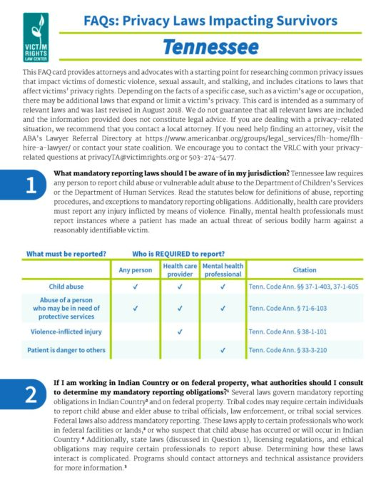 This FAQ provides attorneys and advocates with a starting point for researching common privacy issues that impact victims of domestic violence, sexual assault, and stalking, and includes citations to laws that affect victims’ privacy rights.