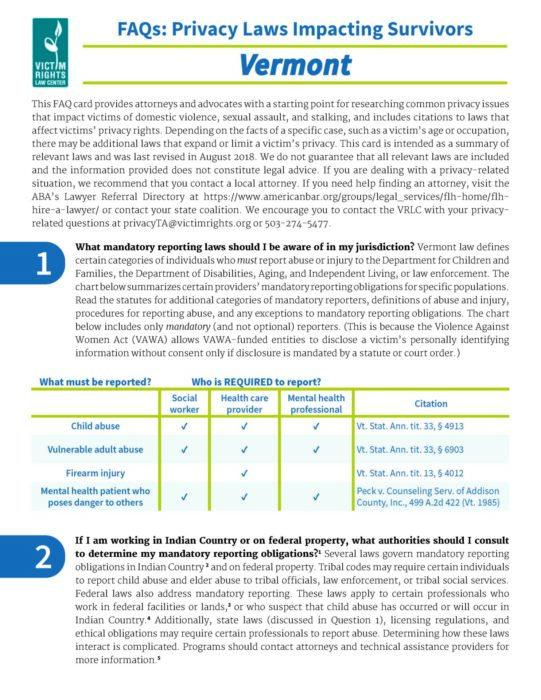 This FAQ provides attorneys and advocates with a starting point for researching common privacy issues that impact victims of domestic violence, sexual assault, and stalking, and includes citations to laws that affect victims’ privacy rights.