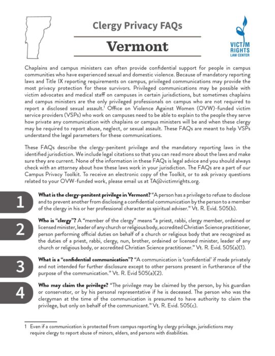 These FAQs describe the clergy-penitent privilege and the mandatory reporting laws in the identified jurisdiction. We include legal citations so that you can read more about the laws and make sure they are current.