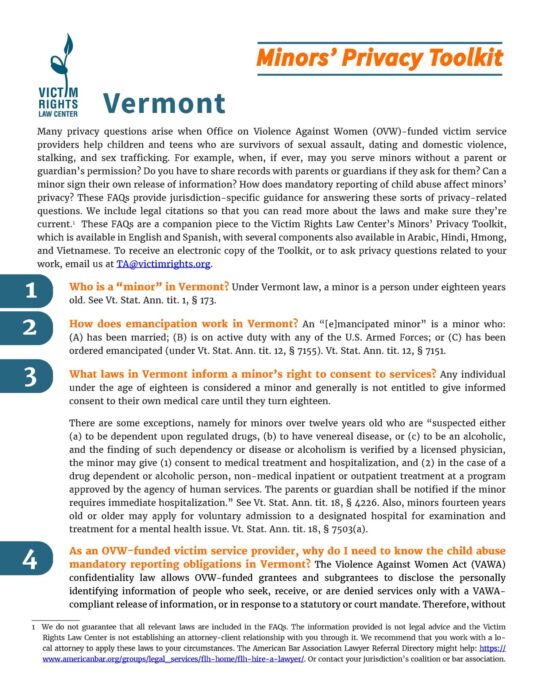 These FAQs provide guidance for answering the many privacy questions that arise when victim service providers help children and teens who are survivors of sexual assault, dating and domestic violence, stalking, and sex trafficking.
