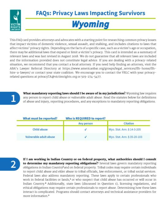 This FAQ provides attorneys and advocates with a starting point for researching common privacy issues that impact victims of domestic violence, sexual assault, and stalking, and includes citations to laws that affect victims’ privacy rights.