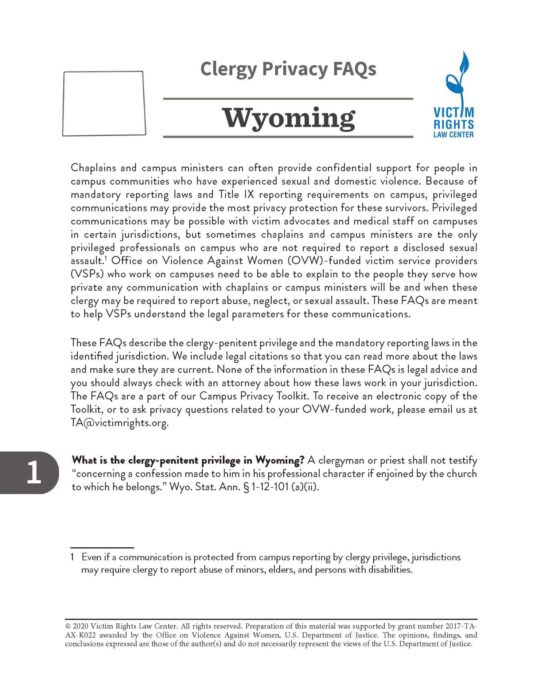 These FAQs describe the clergy-penitent privilege and the mandatory reporting laws in the identified jurisdiction. We include legal citations so that you can read more about the laws and make sure they are current.
