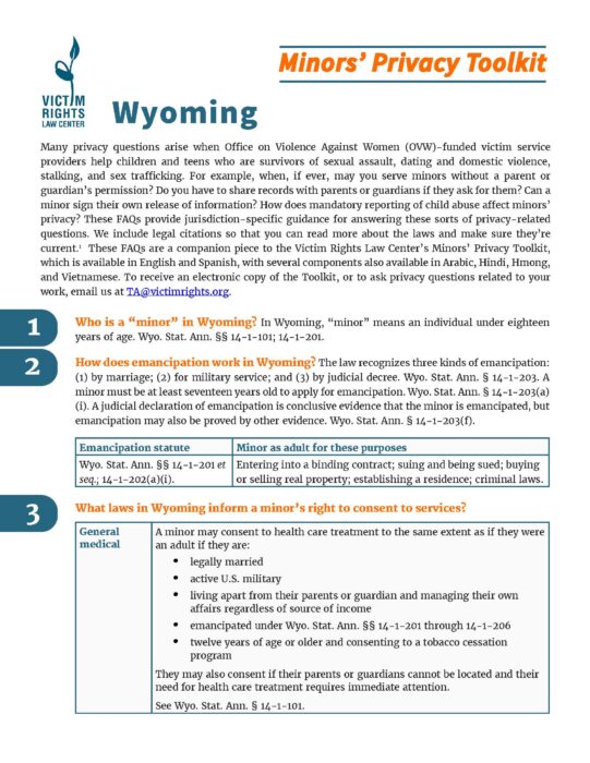 These FAQs provide guidance for answering the many privacy questions that arise when victim service providers help children and teens who are survivors of sexual assault, dating and domestic violence, stalking, and sex trafficking.